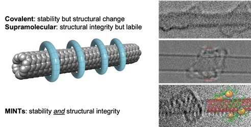 We have developed a general strategy for the synthesis of rotaxane-type derivatives of carbon nanotubes, the first example of mechanically interlocked derivatives of SWNTs which we call MINTs (Angew. Chem. Int. Ed., 2014, 53, 5394-5400, Highlighted in Chem&Eng News, 2014, 92, 31; Chem. Soc. Rev. 2019, 48, 5016-5032). In the key rotaxane-forming step, we employ U-shaped macrocycle precursors equipped with two recognition units (i.e. two molecular fragments that like to “stick” to the nanotube) and terminated with bisalkenes that are closed around the nanotubes through ring-closing metathesis (RCM). The formation of MINTs does not involve modification of the sp2 C-C conjugated structure of the nanotubes, from which all their amazing properties emerge. Furthermore, because the SWNTs are too long for the macrocycle to find their tips and “fall off”, the mechanical link in MINTs is as kinetically stable as a covalent bond, but without messing with the native structure of the SWNTs.